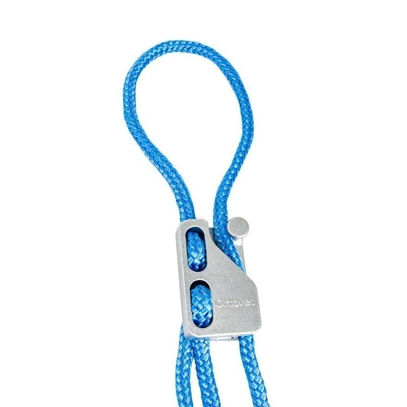 Modo 2: Amarre uma das extremidades da corda na medida 10mm na alça da cabeçada odontológica Ortovet® de qualquer modelo. Passe a outra extremidade da corda por dentro do trava corda, entrelaçando pelos quatro orifícios (de baixo para cima). Depois disso, a corda que deve passar por cima de um ponto de apoio ou viga, de volta, faça com que a mesma retorne passando entre o pino de apoio da lateral do instrumento. Para travar, pressione a corda em direção ao interior da cavidade dentada do instrumento, desta maneira a corda se prenderá facilmente regulando a altura desejada, devido ao próprio peso da cabeça do animal.